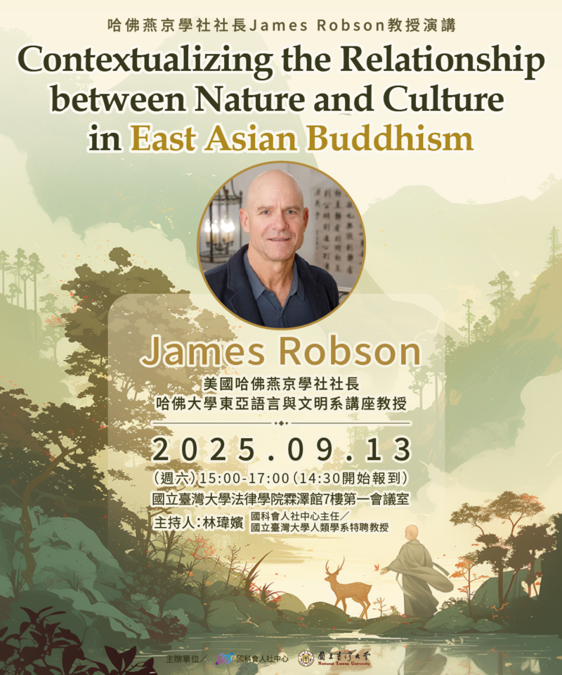 國科會人社中心非常榮幸能夠邀請到哈佛燕京學社社長、哈佛大學東亞系羅柏松(James Robson)講座教授蒞臨演講。羅伯松教授為國際知名漢學與東亞宗教研究學者,興趣涵蓋佛教、道教、禪宗及宗教地理,其著作《聖地之力:中古中國南嶽的宗教地景》(Power of Place: The Religious Landscape of the Southern Sacred Peak (Nanyue南嶽) in Medieval China)榮獲法國重要漢學榮譽Stanislas Julien Prize(儒蓮獎)及佛教學界具指標性的沼田智秀佛教書籍獎(Toshihide Numata Book Prize in Buddhism)雙重殊榮。哈佛燕京學社社長親自來臺實屬難得,更特別的是本次演講將以中文進行,我們誠摯歡迎對環境倫理與宗教文化有興趣的學界朋友踴躍參與!