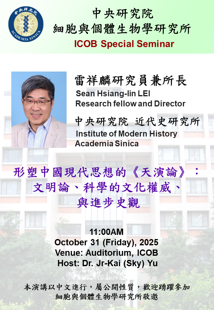 https://icob.sinica.edu.tw/Information/speech_more?id=425ae44e684b45df9cffbc824fb5389c&fbclid=IwY2xjawNunVxleHRuA2FlbQIxMABicmlkETB6cEZjeWVqUVRuZUtsRnQxAR7D_Qh5JfQK7p8vjsyQKMUit0wpDCYEL-7bayqEwKRJTYNzX5UP0WVHIjAlqg_aem_EhfP5RkEcrIFQqS7zdy8vA